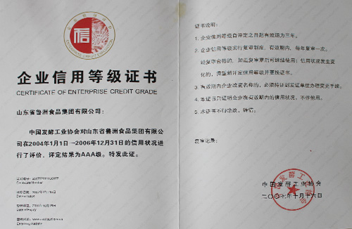 發(fā)酵行業(yè)企業(yè)信用評(píng)價(jià)AAA級(jí)